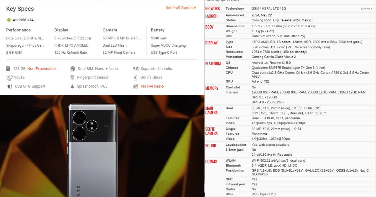 अन्य खासियतें: इन-डिस्प्ले फिंगरप्रिंट सेंसर, 3D गोरिल्ला ग्लास विक्टस 2 प्रोटेक्शन, Android 14 पर आधारित Realme UI 5